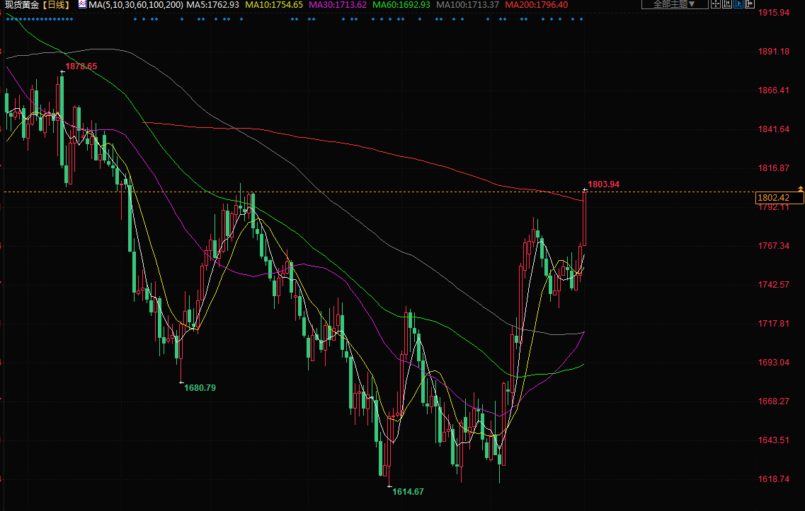 现货金攀升1.8%,至每盎司1800.69美元,稍早曾触及1803.94美元的8月10日以来最高。