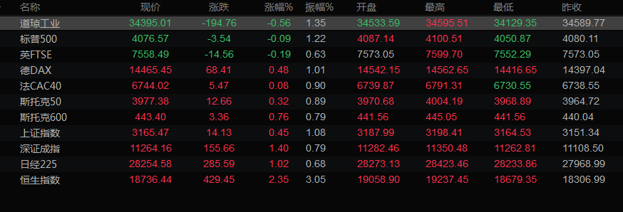 美股收盘情况: 标普500指数下跌0.08%,收报4076.79点。纳斯达克指数上涨0.13%,至11482.45点, 道琼斯工业指数下跌0.56%,至34396.53点。